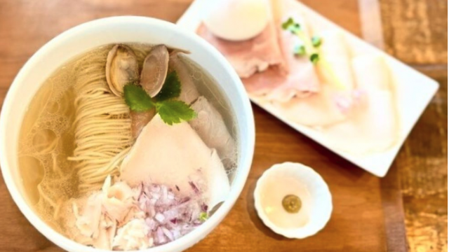 「塩鶏つけ麺」は丹波地鶏が使われており、九条ネギが大盛りで麺がもちもち。
